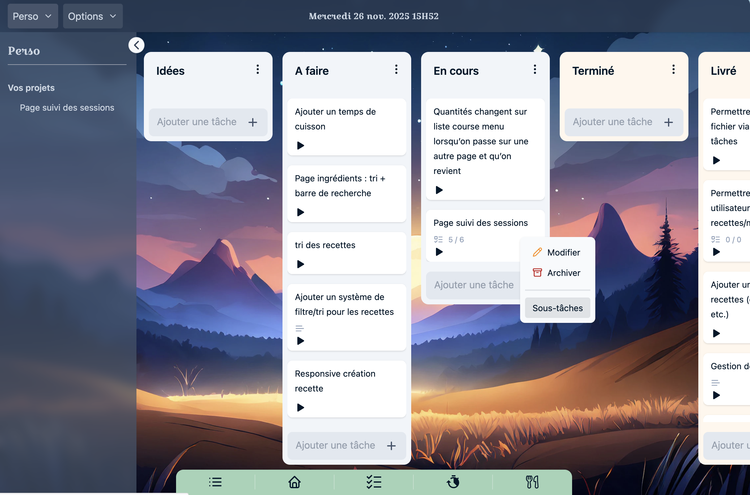 HTools est une application développée pour répondre à mes besoins personnels. Basée sur un système de modules, elle me permet de gérer mes rappels, mes tâches clients avec tableaux Kanban et suivi du temps de travail en sessions. Elle offre aussi une vue calendrier filtrable et un export CSV pour faciliter la facturation. Un module intégré permet de gérer menus, recettes et listes de courses automatiquement.